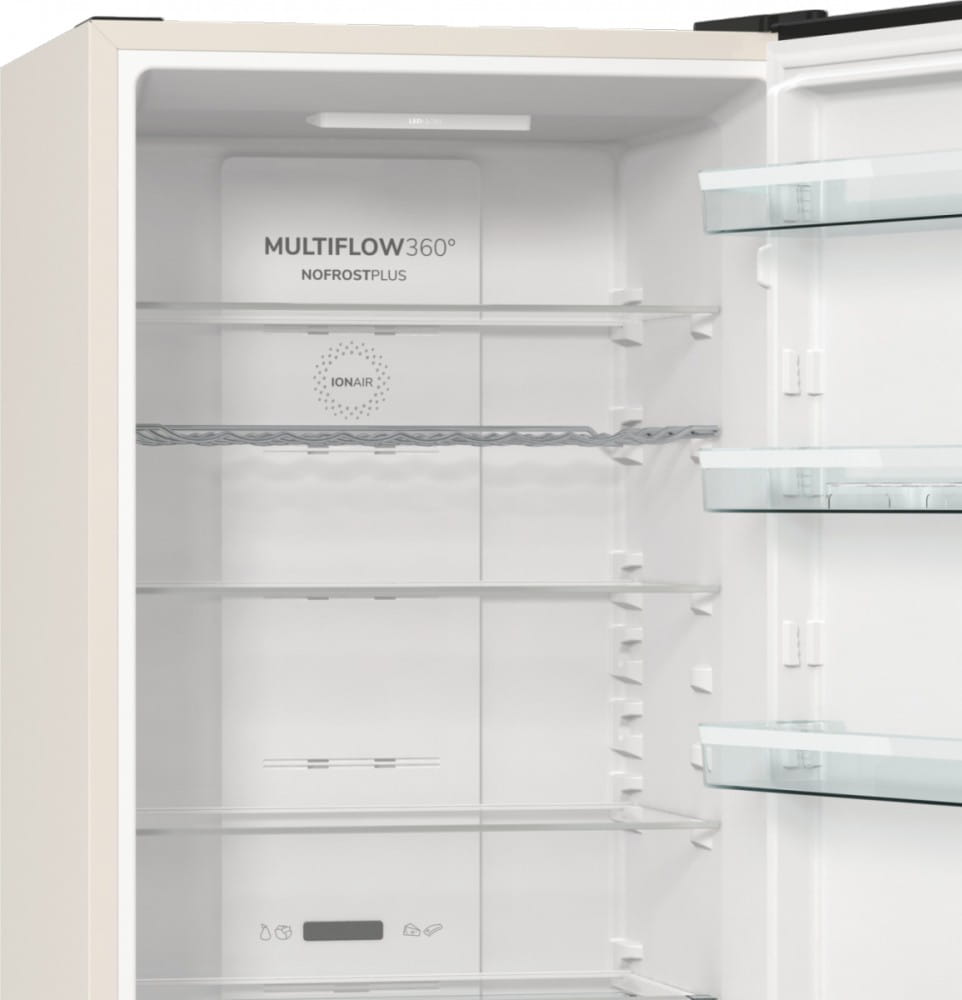IonAir wytwarza ujemnie naładowane jony wewnątrz urządzenia, które są równomiernie rozmieszczone w komorze chłodziarki dzięki systemowi MultiFlow 360°. Tak wzbogacone powietrze zachowuje smak i usuwa nieprzyjemne zapachy.