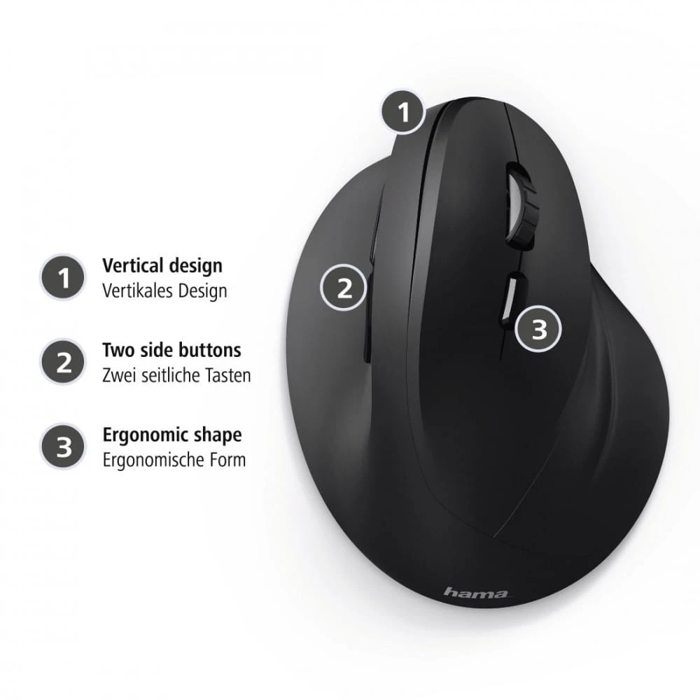 - Pionowy kształt myszy zapobiega powstawaniu napięć i bólu w barku i w nadgarstku