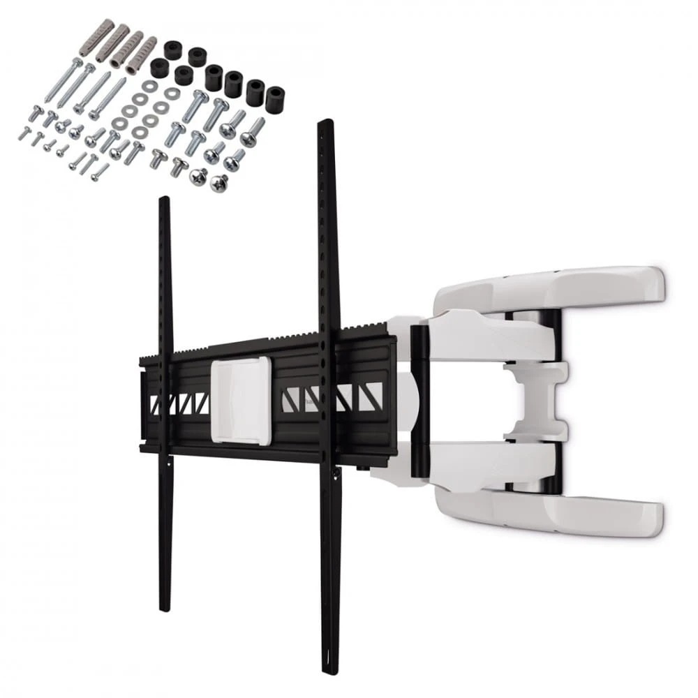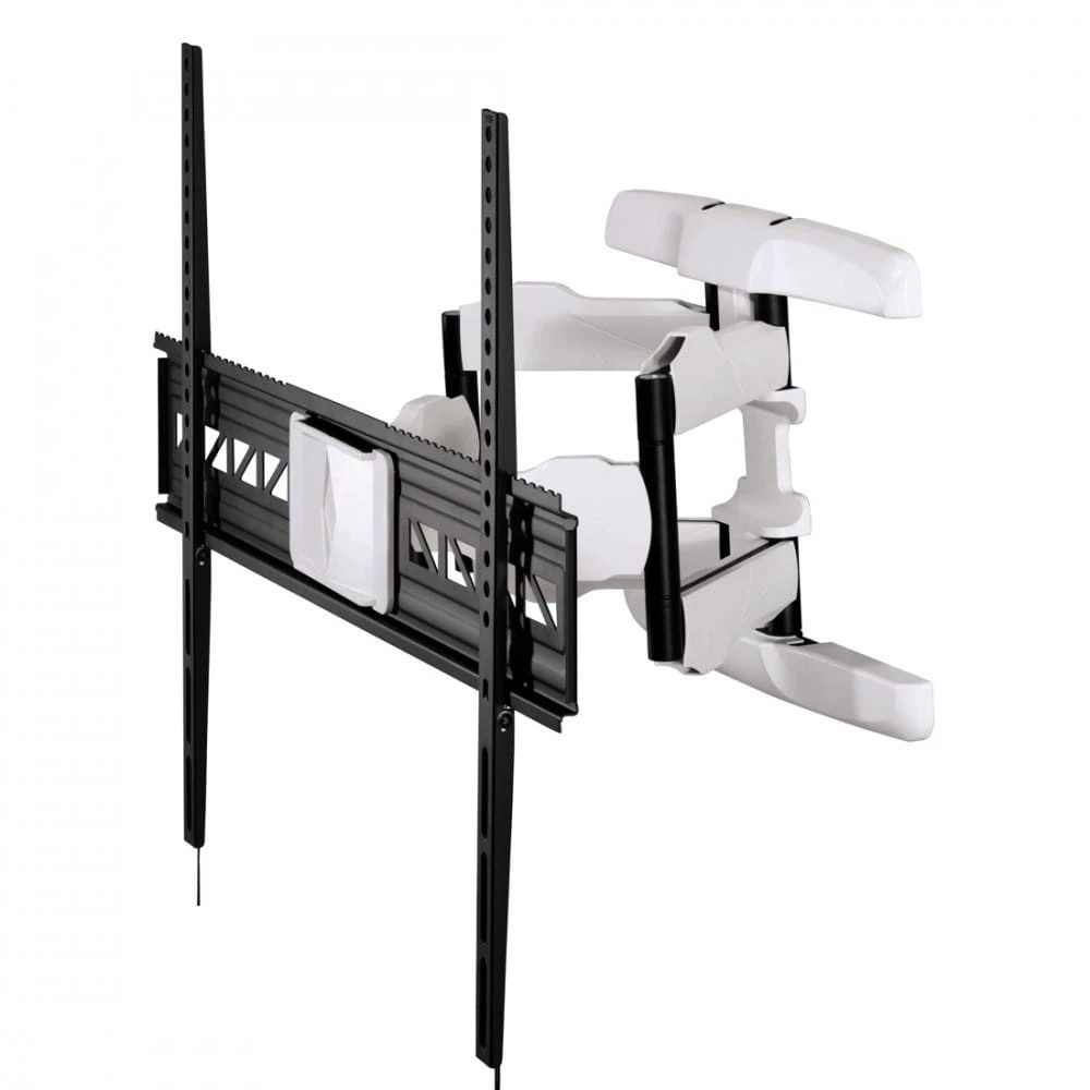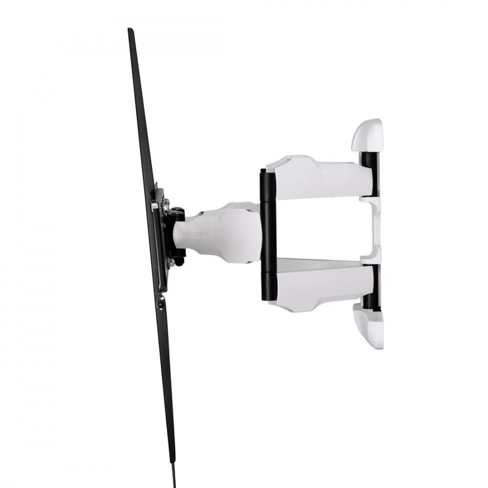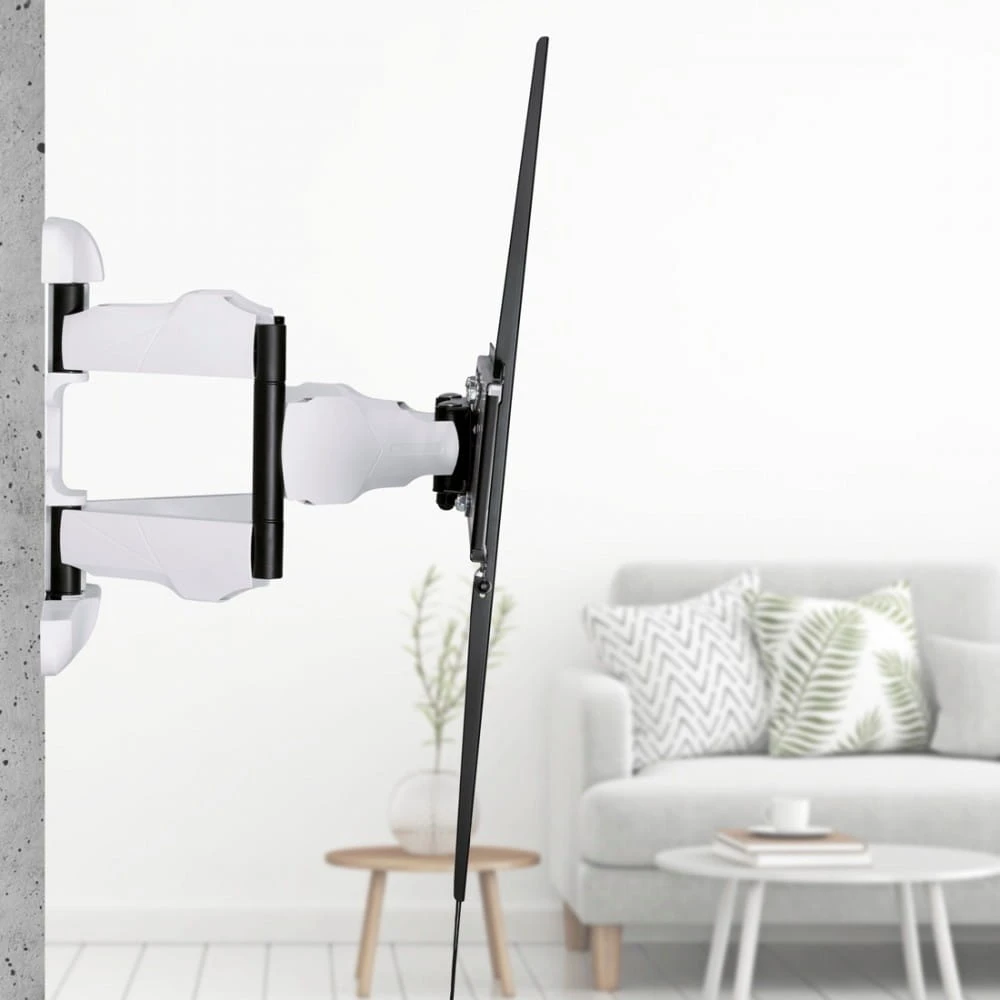 Panel i ramiona podporowe w kolorze białym zlewają się ze ścianą, zapewniając harmonijną aranżację. Natomiast czarna płytka mocująca odpowiada kolorowi telewizora. Takie rozwiązanie pasuje do wystroju wnętrza.
