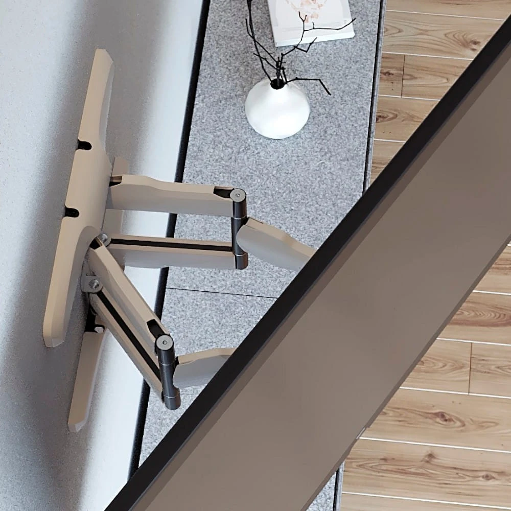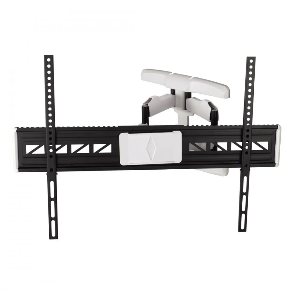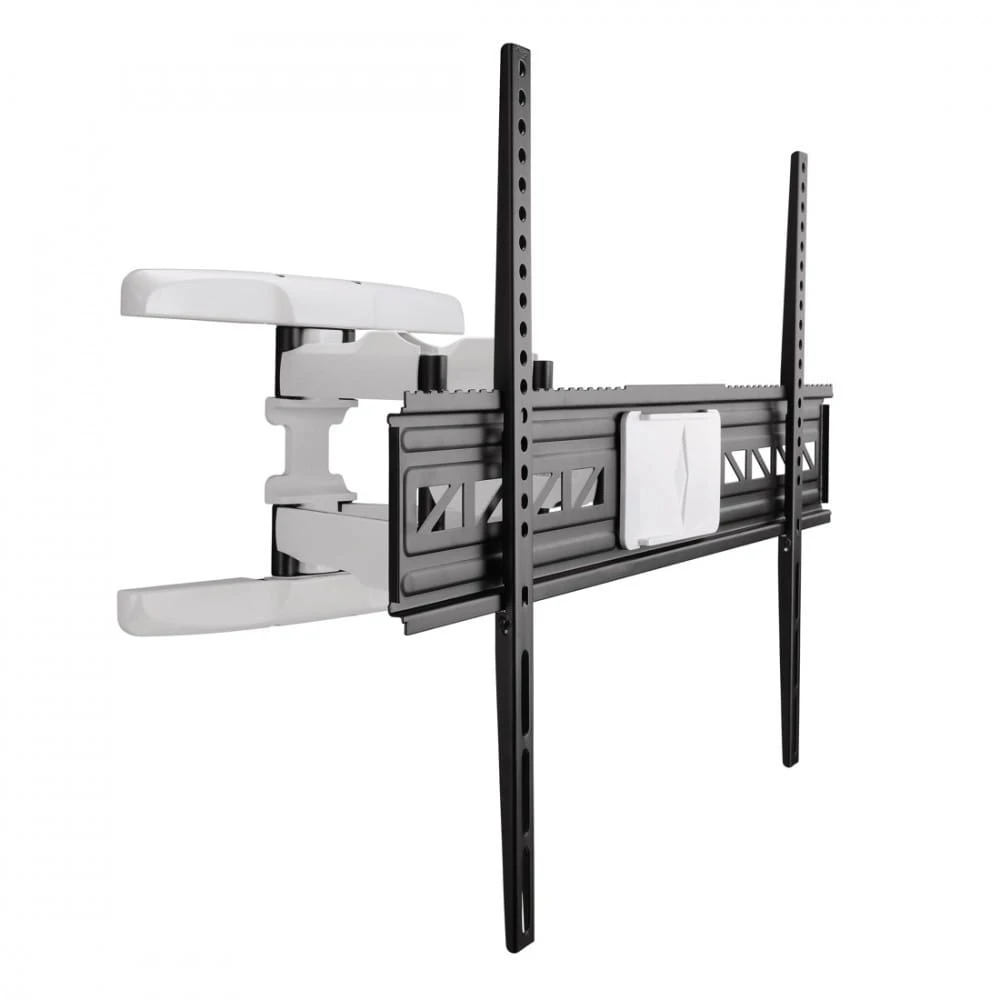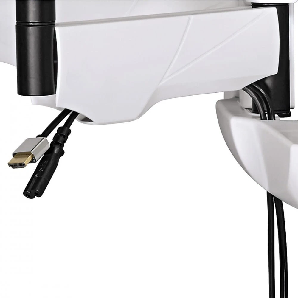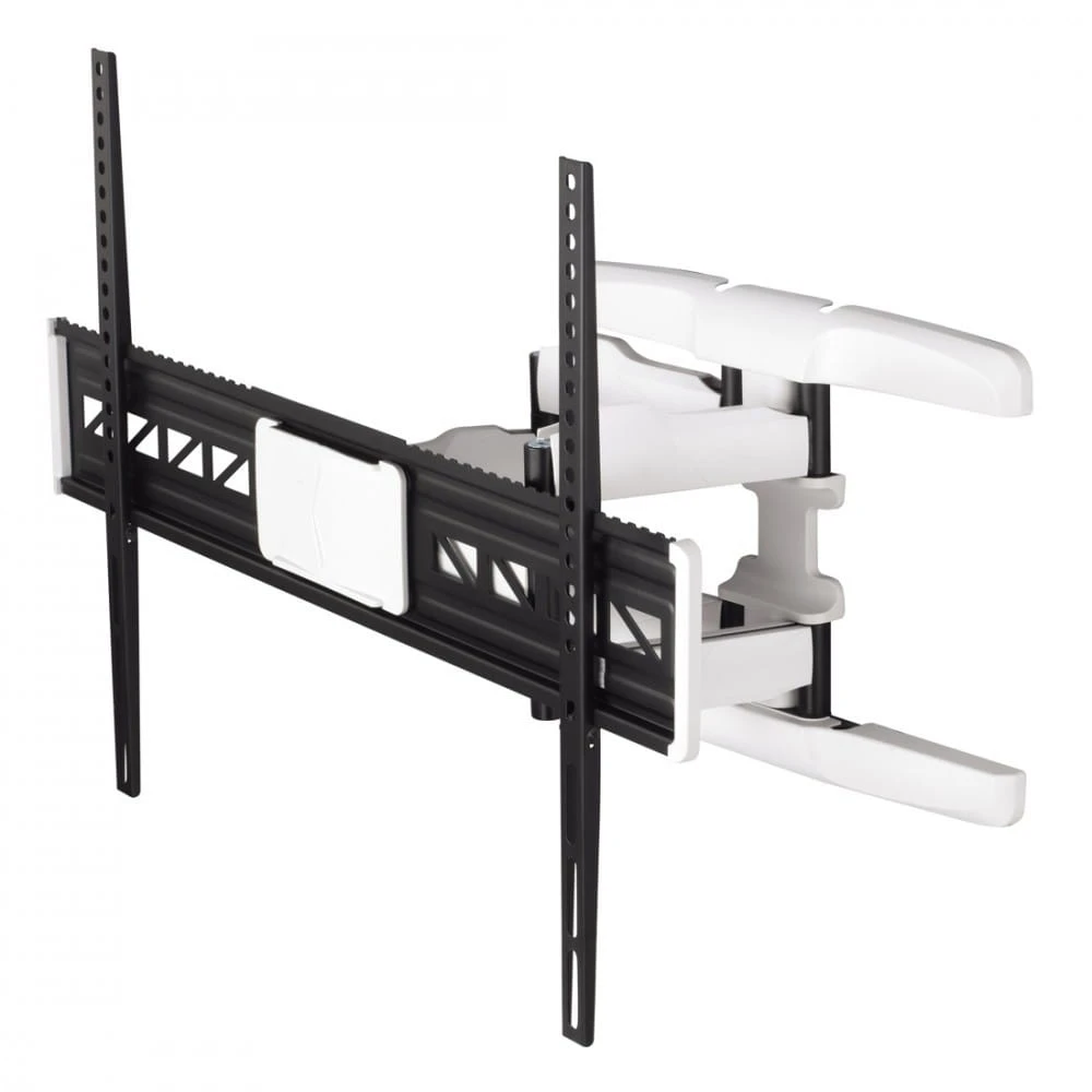 Panel i ramiona podporowe w kolorze białym zlewają się ze ścianą, zapewniając harmonijną aranżację. Natomiast czarna płytka mocująca odpowiada kolorowi telewizora. Takie rozwiązanie pasuje do wystroju wnętrza.