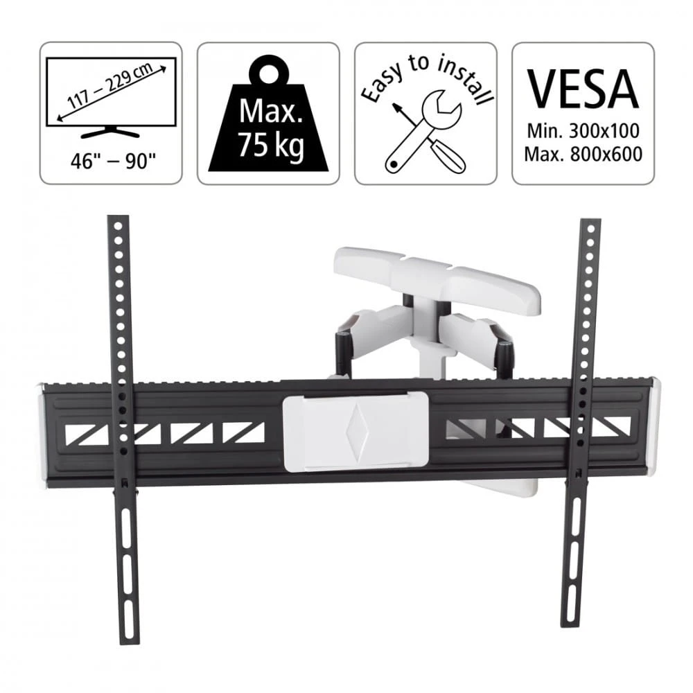 Uchwyt do telewizora Hama jest przeznaczony do urządzeń o przekątnej ekranu od 46" do 90" (117 229 cm). Jest zgodny ze standardem VESA od 300 x 100 do 800 x 600. Maksymalne obciążenie uchwytu wynosi 75 kg.