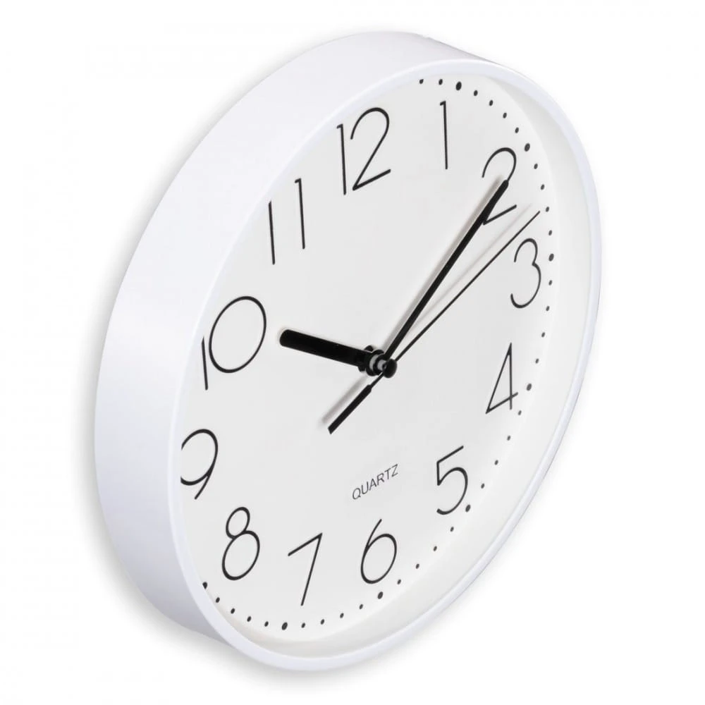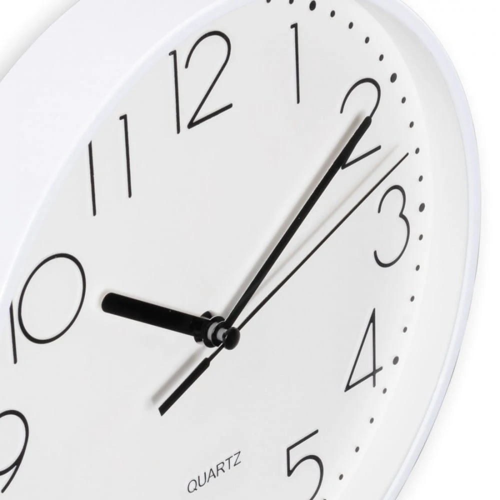 Biała tarcza z czytelnymi cyframi arabskimi oraz wskazówkami godzinową, minutową i sekundową ułatwia szybkie odczytanie czasu. Uniwersalny wygląd dopasuje się do każdego wnętrza od nowoczesnych po klasyczne aranżacje.