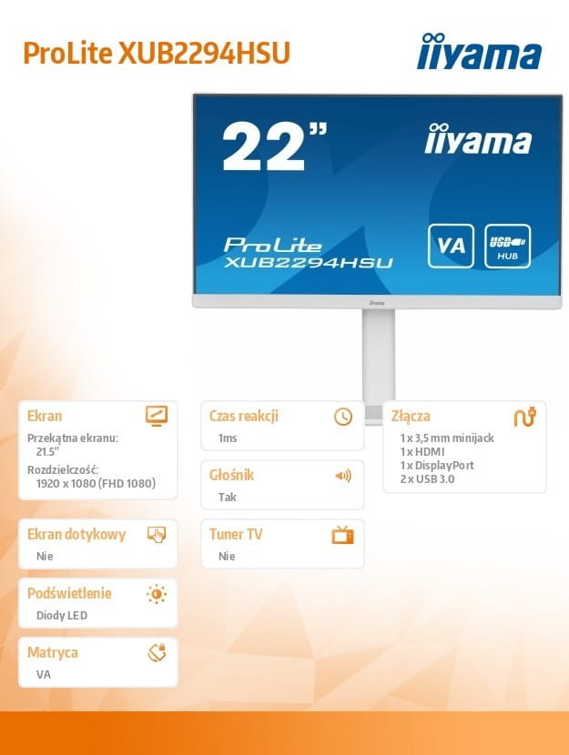 IIYAMA Monitor 21.5 cala XUB2294HSU-W2 VA,FHD,HDMI,DP,HAS(150mm)USB3.0,2x2W