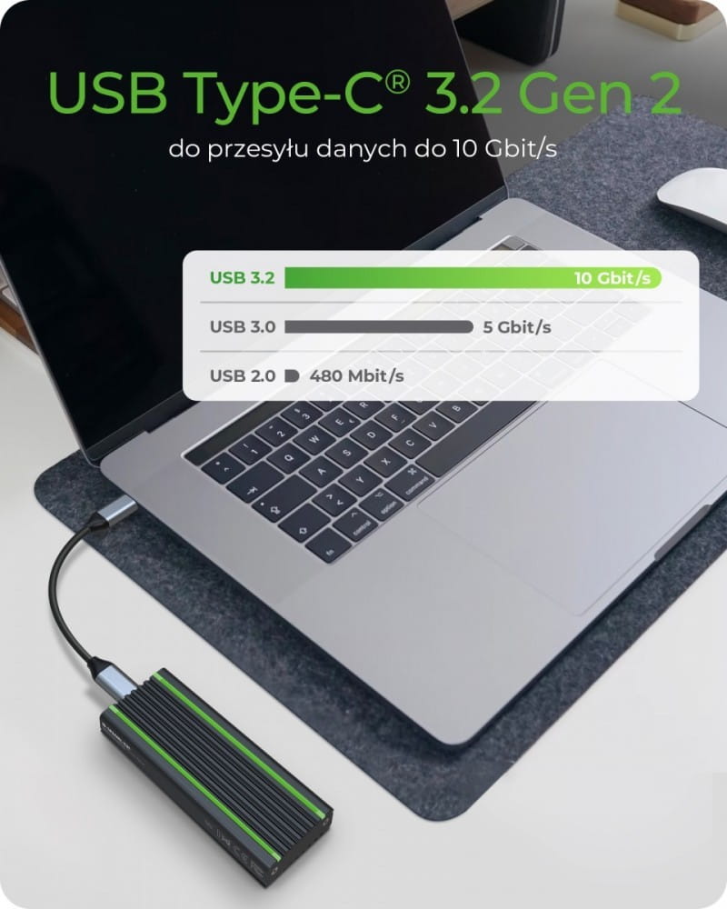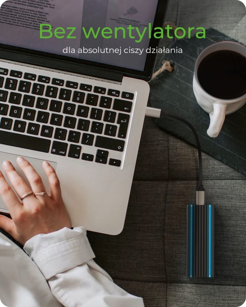 Obudowa USB Type-C dla dysku M.2 NVMe SSD z oświetleniem RGB Wysokiej jakości aluminiowa obudowa z innowacyjną konstrukcją żeber chłodzących Oświetlenie RGB ze zmieniającymi się kolorami Połączenie z komputerem głównym: USB 3.1 (Gen 2) Type-C i Type-A Szybkość przesyłania danych PCIe 3.0 x2 do 10 Gbit / s Gniazdo M-Key do dysków SSD NVMe, 22x 30/42/60/80 mm Aktywacja ochrony przed zapisem za pomocą przełącznika Obsługuje Windows, macOS