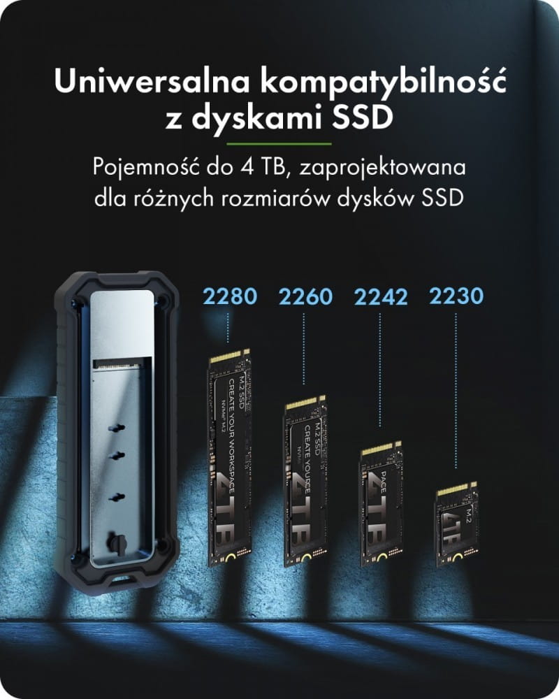 Elastyczna kompatybilność - obsługuje dyski SSD M-Key i B+M-Key zarówno NVMe, jak i SATA. Pasuje do dysków M.2 o rozmiarach od 2230 do 2280, zapewniając elastyczność korzystania z różnych typów i pojemności pamięci masowej. - Dysk SSD M.2 NVMe i SATA
