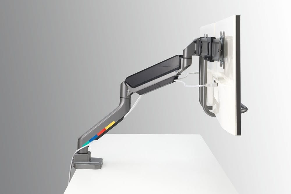 Większość ramion do monitorów wymaga włożenia sporego wysiłku w zmianę ich położenia. Stanowi to wyzwanie dla profesjonalistów pracujących przy "gorących biurkach", którzy chcą poprawić ergonomię swoich stanowisk roboczych. Podwójne ramię SmartFit do monitora z poprzeczką i rączką pozwala na precyzyjne uzyskanie ergonomicznego położenia monitorów bez użycia sił. Rączka pozwala unieść lub opuścić monitory bez użycia siły. Gazowy wysięgnik sprawia, że nawet najcięższe monitory stają się lekkie jak piórko, więc każda osoba będzie mogła szybko dostosować miejsce pracy do własnych potrzeb i preferencji. Rączka daje użytkownikowi pełną swobodę regulacji ergonomii położenia monitorów, gdy musi je unieść, aby zmniejszyć napięcie mięśni szyi, obrócić je, by uzyskać lepszą widoczność treści albo lub zmienić ich układ, aby ułatwić sobie współpracę z innymi osobami.