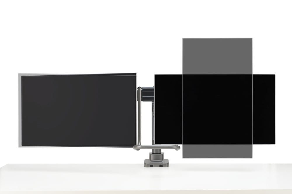 Osobna regulacja położenia każdego z monitorów w poziomie pozwala bez żadnych problemów uzyskać idealny kąt widzenia oraz wygodne i produktywne miejsce pracy. Możliwa jest też regulacja pochylenia w zakresie +/- 10°, obrotu na boki w zakresie +/- 10° oraz obrotu w górę/w dół w zakresie +/- 180°.