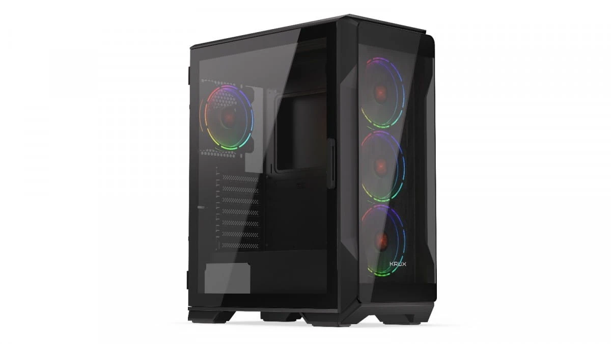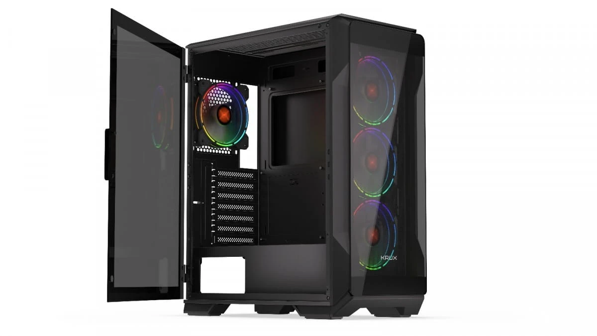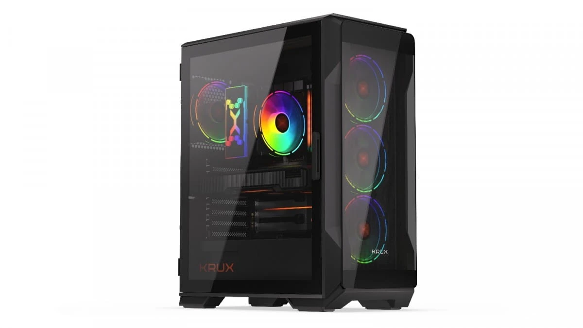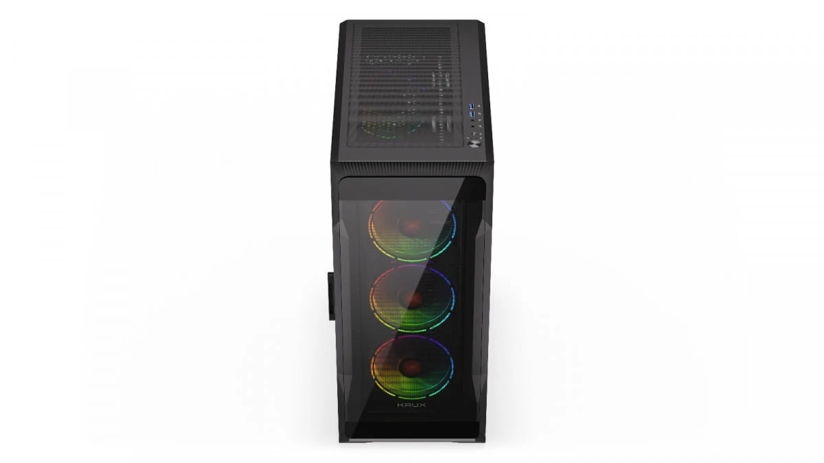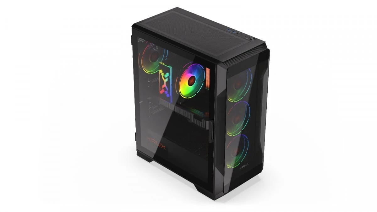 Aż szkoda by było nie wykorzystać tej całej przestrzeni, dlatego w Krux Heko znajdziesz cztery wentylatory ARGB 120 mm trzema z przodu i jednym z tyłu. Nie dość, że wystarczą na zapewnienie niskich temperatur (przynajmniej, dopóki nie odpalisz trzech tytułów AAA naraz), to jeszcze rozświetlą wnętrze Twojej obudowy.