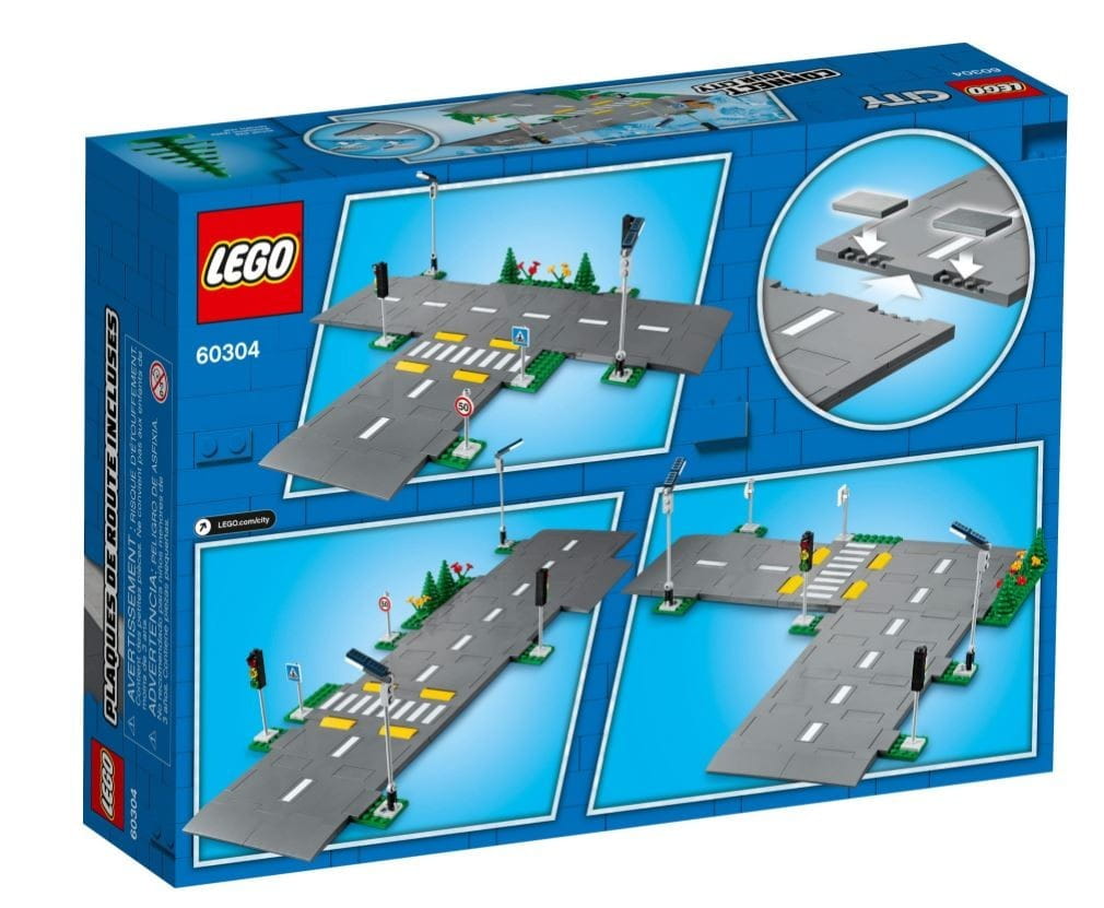 - Co jest w pudełku? Pięć płyt drogowych LEGO z oznaczeniami pasów, progami zwalniającymi i przejściem dla pieszych, a do tego świecące w ciemności latarnie, zabawkowa sygnalizacja świetlna, znaki drogowe, drzewa i elementy zieleni.