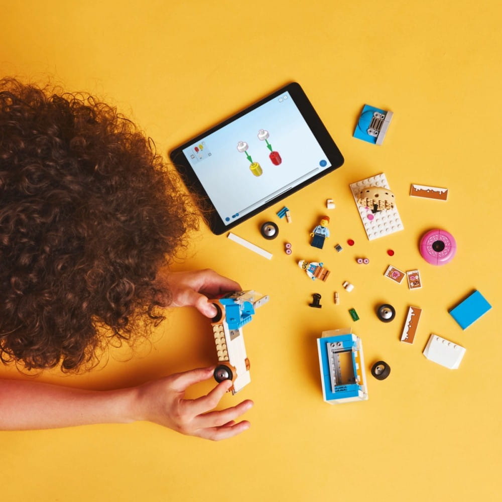 W pudełku znajdują się instrukcje budowania zestawu LEGO City Mobilna pączkarnia. Dzieci mogą też wypróbować aplikację LEGO Builder, gdzie można odkrywać i zapisywać zestawy, śledzić swoje postępy oraz przybliżać i obracać modele podczas budowania.