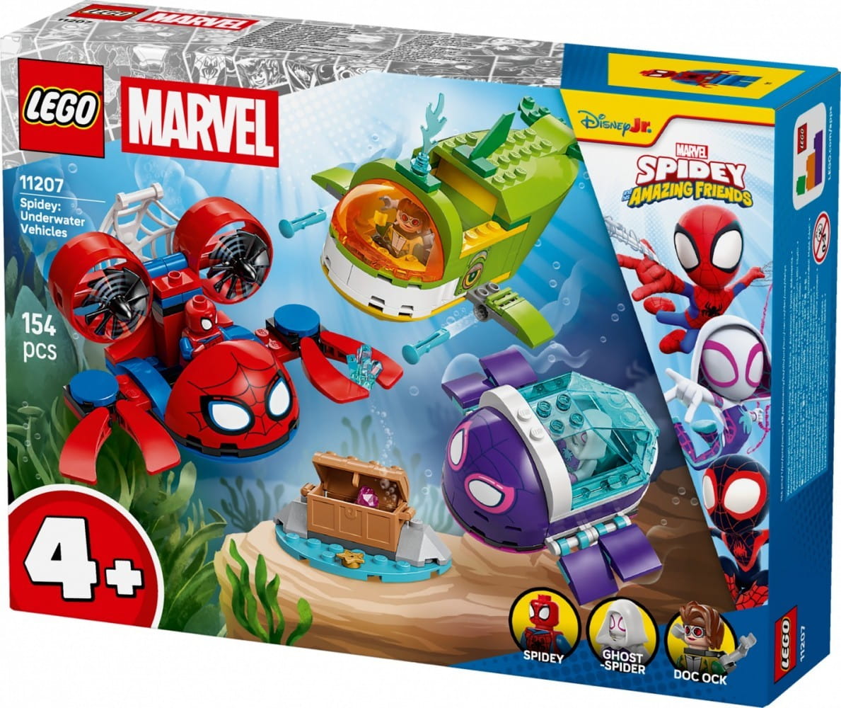 Zestaw konstrukcyjny zawiera trzy pojazdy: łódź podwodną Spideyego w kształcie kraba z dużą siecią-pułapką, łódź podwodną Ghost-Spider w kształcie żółwia z otwieranym przezroczystym pancerzem oraz łódź podwodną Doc Ocka w kształcie wieloryba z wyrzutniami na płetwach i schowkiem na skrzynię ze skarbami. Spidey: podwodne pojazdy to świetny prezent urodzinowy dla fanów serialu Spidey i super-kumple. Zaprojektowany z myślą o początkujących konstruktorach, zawiera kolorowe ilustrowane instrukcje, duże klocki startowe oraz osobne woreczki zawierające po jednym modelu do zbudowania, dzięki czemu budowanie jest szybkie i przyjemne. A dzięki aplikacji LEGO Builder dzieci mogą budować z pewnością siebie. Mogą w niej powiększać modele, obracać w 3D i śledzić postępy dzięki prostym instrukcjom cyfrowym. Zestaw składa się ze 154 elementów.