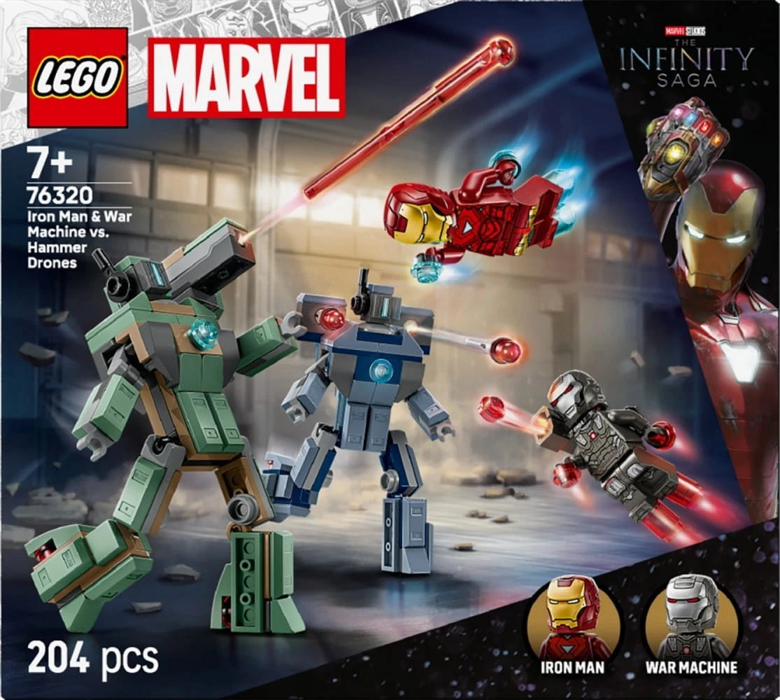 - Minifigurki LEGO Marvel - zawiera minifigurkę Iron Mana z niebieskimi miotaczami w dłoniach i stopach oraz bronią laserową, a także minifigurkę War Machine z czerwonymi miotaczami w dłoniach i stopach oraz miotaczem klocków