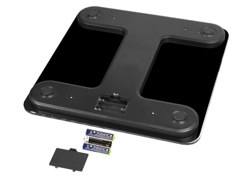 Wytrzymała i stabilna szklana platforma o wymiarach 30x30 cm i grubości 6mm, wyposażona w cztery precyzyjne czujniki umożliwiające precyzyjny pomiar w zakresie od 0 do 150kg a analizę ciała umożliwiają dwie elektrody umieszczone na platformie.