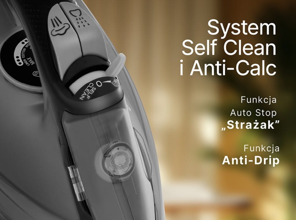 System Anti-Calc i Self Clean: Zabezpieczają żelazko przed osadzaniem się kamienia i ułatwiają jego czyszczenie, zapewniając dłuższą żywotność urządzenia.