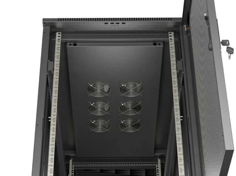 Dzięki zastosowaniu otworu wentylacyjnego w górnej części konstrukcji, każda z naszych szaf zapewnia doskonały przepływ powietrza, co przekłada się na skuteczne chłodzenie. Ten element, w połączeniu z wbudowanymi wentylatorami, gwarantuje kontrolę temperatury wewnątrz szafy, co jest kluczowe dla utrzymania optymalnych warunków pracy dla Twojego sprzętu.