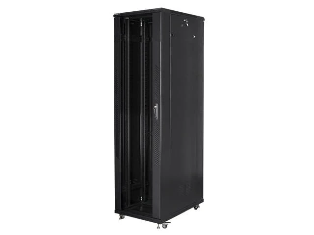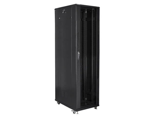 Szafa stojąca jednosekcyjna Lanberg FF01-8047-12B to rozwiązanie przeznaczone do budowy sieci, montażu okablowania oraz sprzętu w rozmiarze 19 o maksymalnym łącznym udźwigu do 800 kg. Może być stosowana w centrach danych, które wymagają dużej ilości miejsca w szafach na urządzenia. Szafa z powodzeniem spełni swoją rolę w dużych, rozbudowanych sieciach i serwerowniach, zarówno w małych, średnich jak i dużych firmach oraz korporacjach. Sprawdzi się również w instalacjach niskoprądowych takich jak sieci telewizji kablowych, systemy alarmowe, przeciwpożarowe, kontroli dostępu oraz systemy monitoringu CCTV i IP. Konstrukcja wykonana jest przy użyciu wysokiej jakości stali walcowanej, charakteryzuje się znakomitym designem i jakością wykonania. Szafa umożliwia pełną regulację głębokości pionowych szyn montażowych. Wyposażona jest w przednie drzwi ze szkła hartowanego z zamkiem, z możliwością montażu prawo lub lewo stronnego. Posiada zdejmowane boczne panele (z zamkami w zestawie) i tylne solidne stalowe drzwi z zamkiem. Istnieje możliwość wprowadzenia okablowania poprzez zamykany górny i dolny panel (z zaślepkami w zestawie). W zestawie znajduje się panel wentylacyjny z 4 wentylatorami 230V. Dodatkowo w komplecie załączone są akcesoria do mocowania szyn nośnych, śruby M6 oraz zaślepki paneli wejściowych, a dzięki konstrukcji do samodzielnego montażu (flat pack), całość znajduje się w 4 płaskich opakowaniach co ułatwia transport.