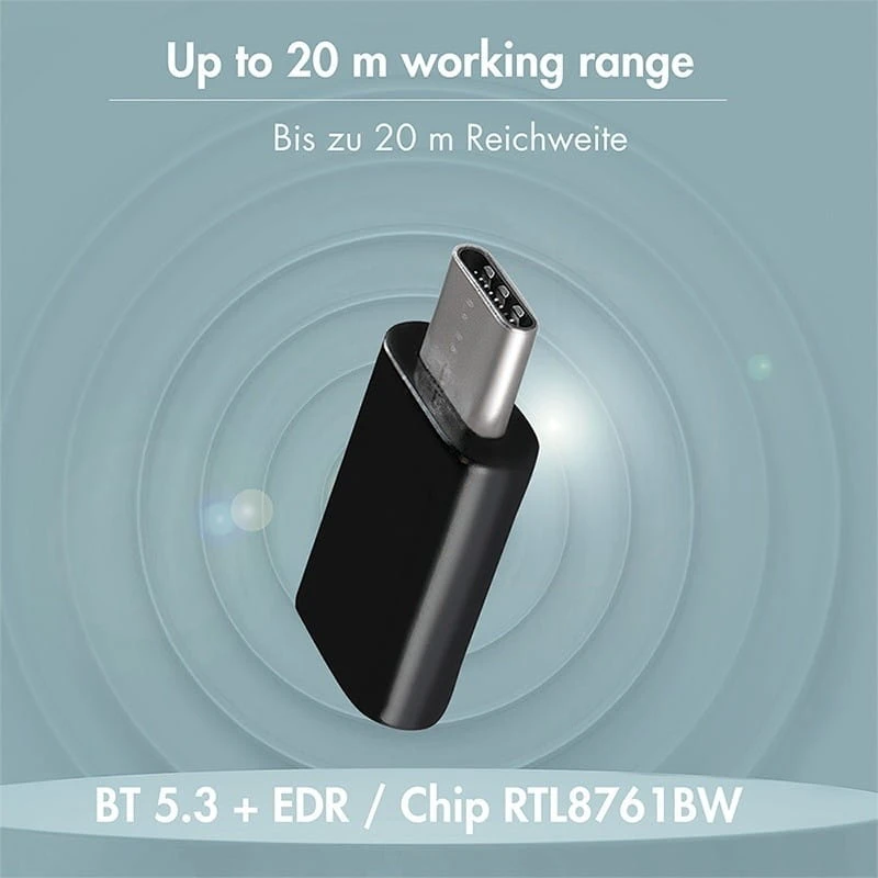 Dzięki technologii BT 5.3 korzystasz ze stabilnego połączenia, wyższej prędkości transmisji i niższego zużycia energii w porównaniu do starszych wersji. Dzięki nowoczesnemu złączu USB-C, które jest coraz częściej stosowane w nowych urządzeniach, jest uniwersalny i kompatybilny z szeroką gamą urządzeń. Jest mały i lekki, dzięki czemu można go łatwo transportować i używać na różnych urządzeniach.