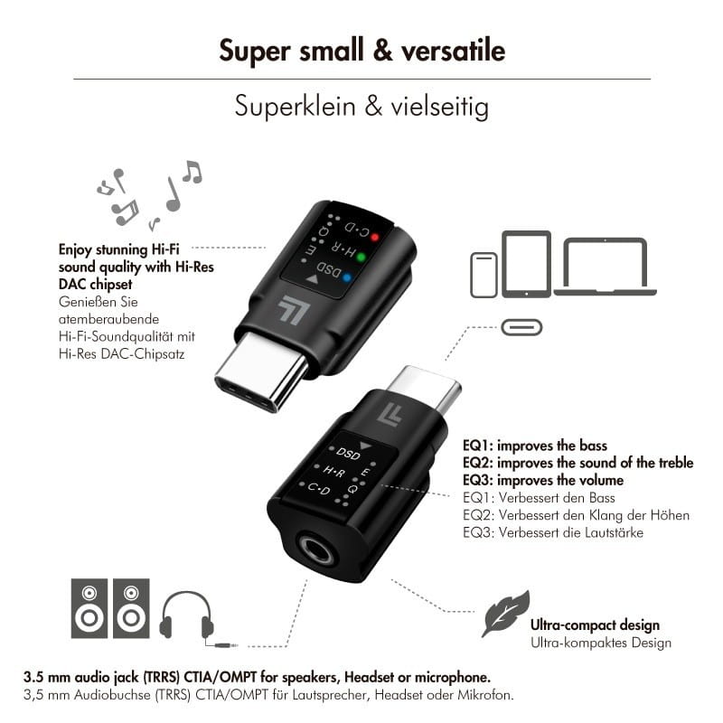 Czy Twój smartfon lub tablet nie ma już standardowego wyjścia jack 3,5 mm na słuchawki, a jedynie port USB-C? Adapter DAC od LogiLink to idealne rozwiązanie dla Ciebie: wystarczy podłączyć UA0424 do portu USB-C, a złącze jack słuchawek do adaptera. Możesz go używać bez problemu, a dzięki dekodowaniu DAC oraz PCM/DSD dźwięk jest znacznie lepszy, co sprawia, że Twoja muzyka brzmi jeszcze lepiej. Dzięki wbudowanemu equalizerowi możesz dostosować dźwięk do swoich osobistych preferencji.