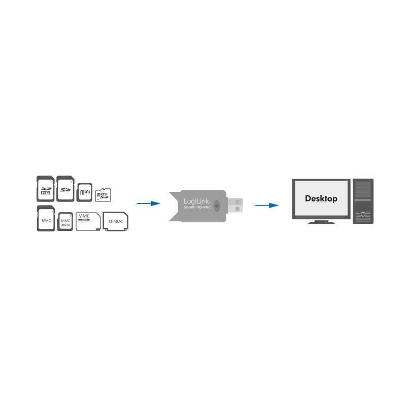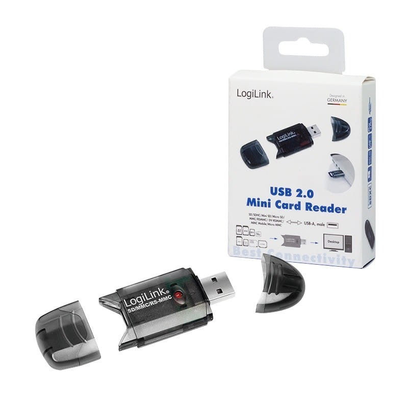 Pozostałe parametry: Czytnik kart w rozmiarze podróżnym Kompaktowy design, idealny na podróż Złącze: USB-A (męskie) Zgodny ze specyfikacją USB 2.0/1.1 Maks. prędkość transferu danych: 480 MBit/s Obsługuje karty SD, SDHC, MMC, RS-MMC, RS-MMC DV, MMCmobile Obsługuje Windows i Mac OS Plug-and-play bez potrzeby instalacji sterowników