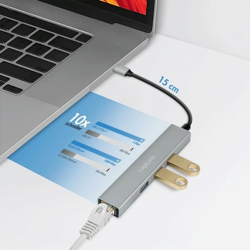 Rozszerz możliwości swojego urządzenia USB-C o szybkie połączenie sieciowe i trzy dodatkowe porty USB. LogiLink UA0461 zapewnia stabilne połączenie Gigabit Ethernet, umożliwiając nieprzerwane wideokonferencje, przesyłanie dużych ilości danych lub tworzenie kopii zapasowych serwerów. Podłącz jednocześnie klawiaturę, mysz lub pamięć USB do laptopa, tabletu lub smartfona. Ultrasmukła aluminiowa obudowa zmieści się w każdej torbie i nie wymaga zewnętrznego zasilania. Dzięki technologii Plug & Play hub jest gotowy do natychmiastowego użycia idealny do pracy mobilnej lub jako kompaktowe rozwiązanie w domowym biurze.