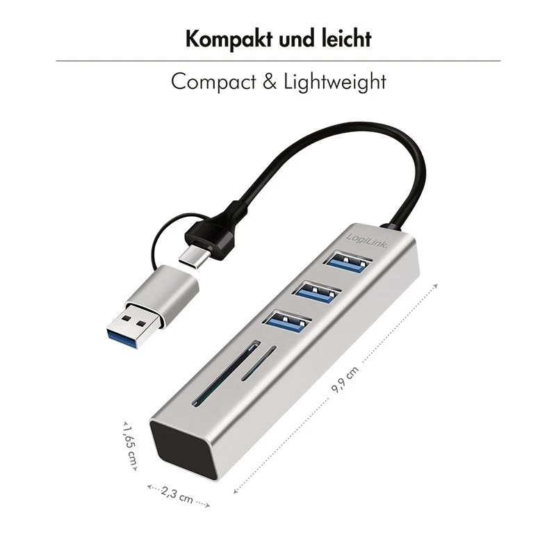 Rozszerz funkcjonalność swojego urządzenia w mgnieniu oka dzięki hubowi LogiLink USB-C z 3 portami i czytnikiem kart. To kompaktowe i przenośne rozwiązanie jest idealne do natychmiastowego dodania trzech portów USB-A oraz czytnika kart SD i microSD do laptopa, smartfona lub tabletu z obsługą USB-C lub Thunderbolt 3/4. Dzięki wszechstronnemu kablowi 2-w-1 można podłączyć hub zarówno do nowoczesnych urządzeń USB-C, jak i konwencjonalnych urządzeń USB-A.