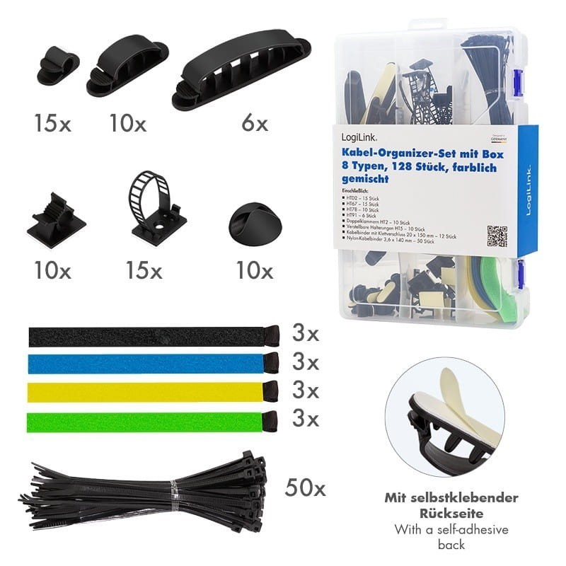 Zestaw organizerów kabli od LogiLink składający się z 8 różnych elementów (opaski kablowe, klipsy i uchwyty) w przezroczystym, przejrzystym pudełku transportowym i do przechowywania.