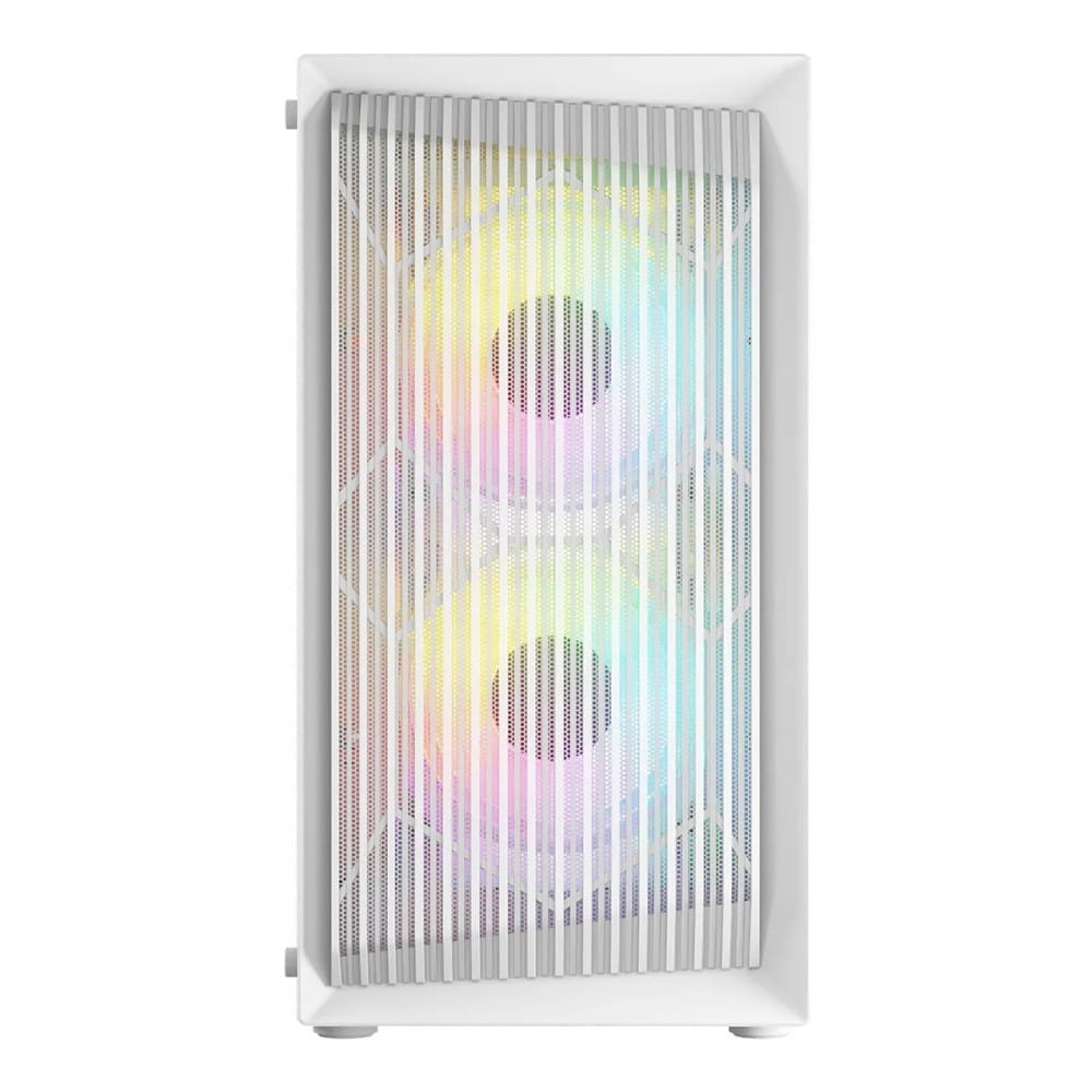 Pozostałe parametry: Karty rozszerzeń PCI: x 4 Instalacja zasilacza ATX: na dole Maksymalny rozmiar płyty głównej: micro-ATX Możliwość montażu kart grafiki: do 290 mm Maksymalna wysokość chłodzenia procesora: 160 mm Miejsca montażu wentylatorów: Przód 2 x 120 mm lub 2 x 140 mm. Tył 1 x 120 mm. Zainstalowane podświetlane wentylatory: 2 x 120 mm na panelu przednim ARGB 1 x 120 mm na panelu tylnym ARGB