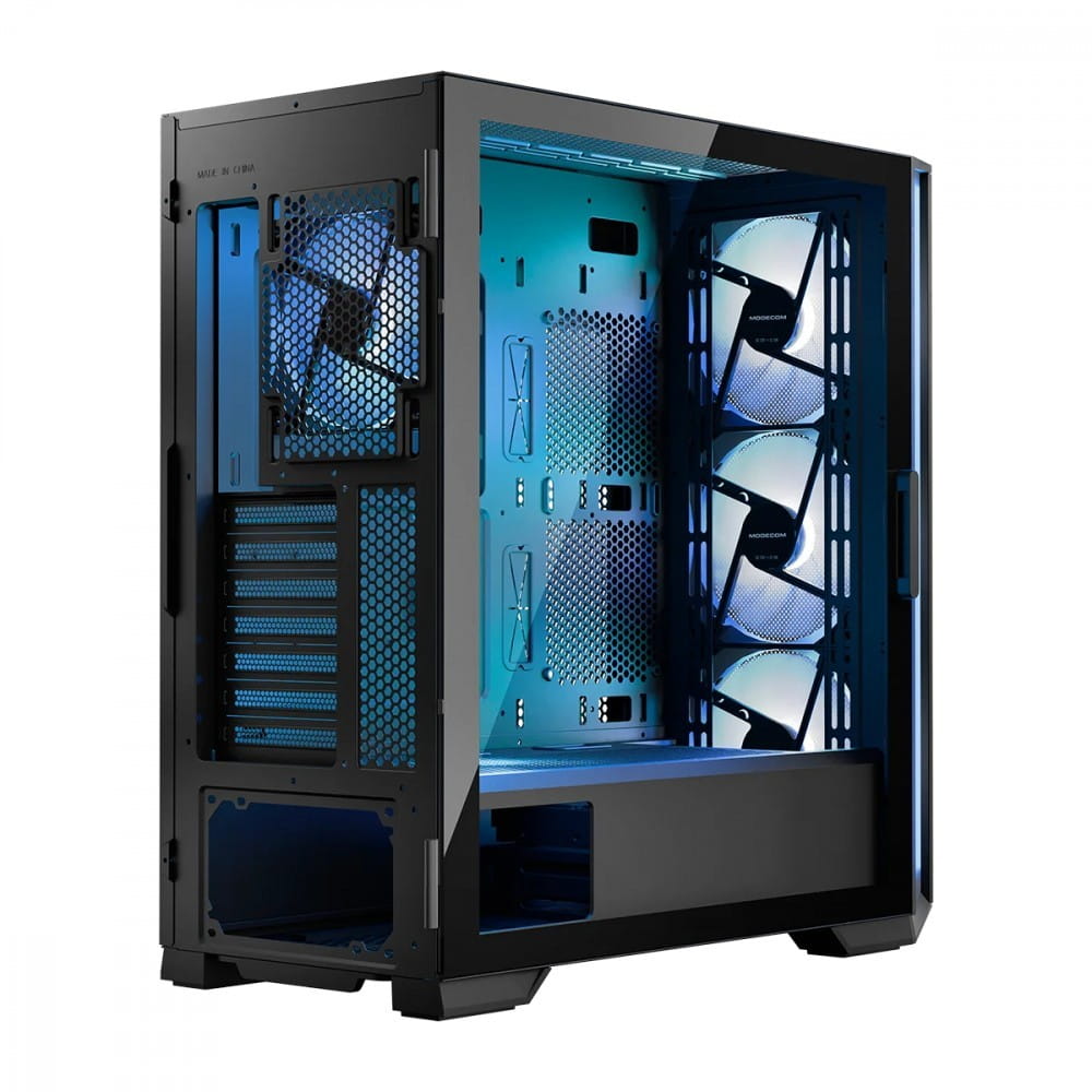 MODECOM Horizon to jedna z tych obudów, która w całości spełnia potrzebę posiadania porządnej, solidnie wykonanej i funkcjonalnej obudowy komputerowej. Ta klasycznie wyglądająca skrzynka ma do zaoferowania naprawdę wiele. Są tu zamontowane w standardzie trzy wentylatory ARGB 140 mm z przodu i jeden 120 mm ARGB z tyłu obudowy. Do tego w środku znajdziesz masę miejsca nawet na płyty E-ATX, wysokie chłodzenie procesora i długie karty graficzne. A to wszystko zamknięte za przeszklonym panelem w postaci drzwiczek, otoczone przewiewnymi panelami mesh z filtrami przeciwkurzowymi. Całość zamknięte w jednej, świetnie zaprojektowanej obudowie MODECOM Horizon.