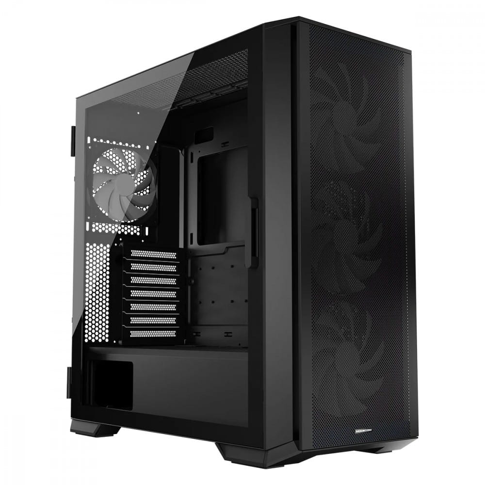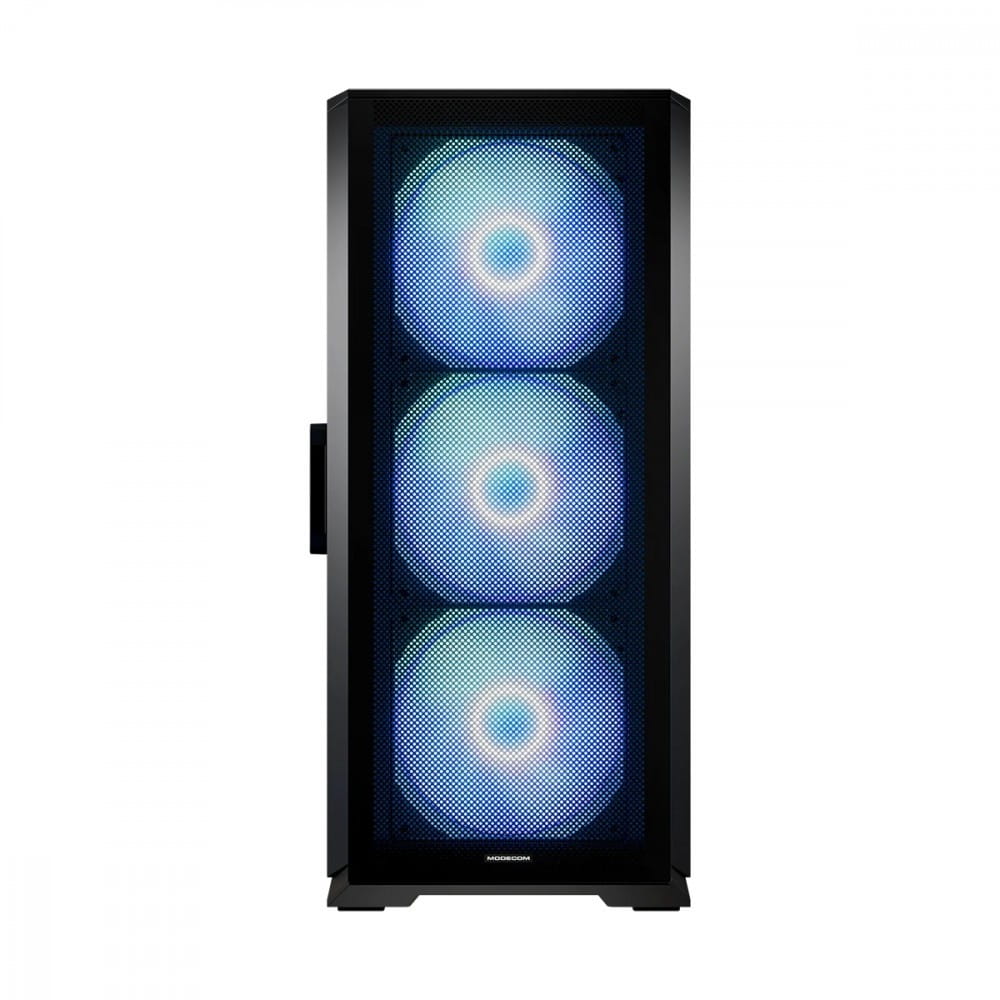 - 3 wentylatory 140 mm ARGB fabrycznie zainstalowane na froncie obudowy. 1 wentylator 120 mm ARGB fabrycznie zainstalowany na tyle obudowy. Szklany panel boczny w postaci otwieranych drzwiczek na zawiasach. Przewiewny panel frontowy i górny.