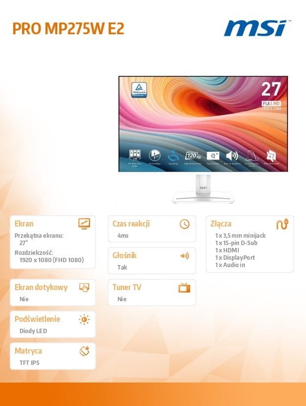 MSI Monitor PRO MP275W E2 27 cali/LED/FHD/FLAT/120Hz/Biały