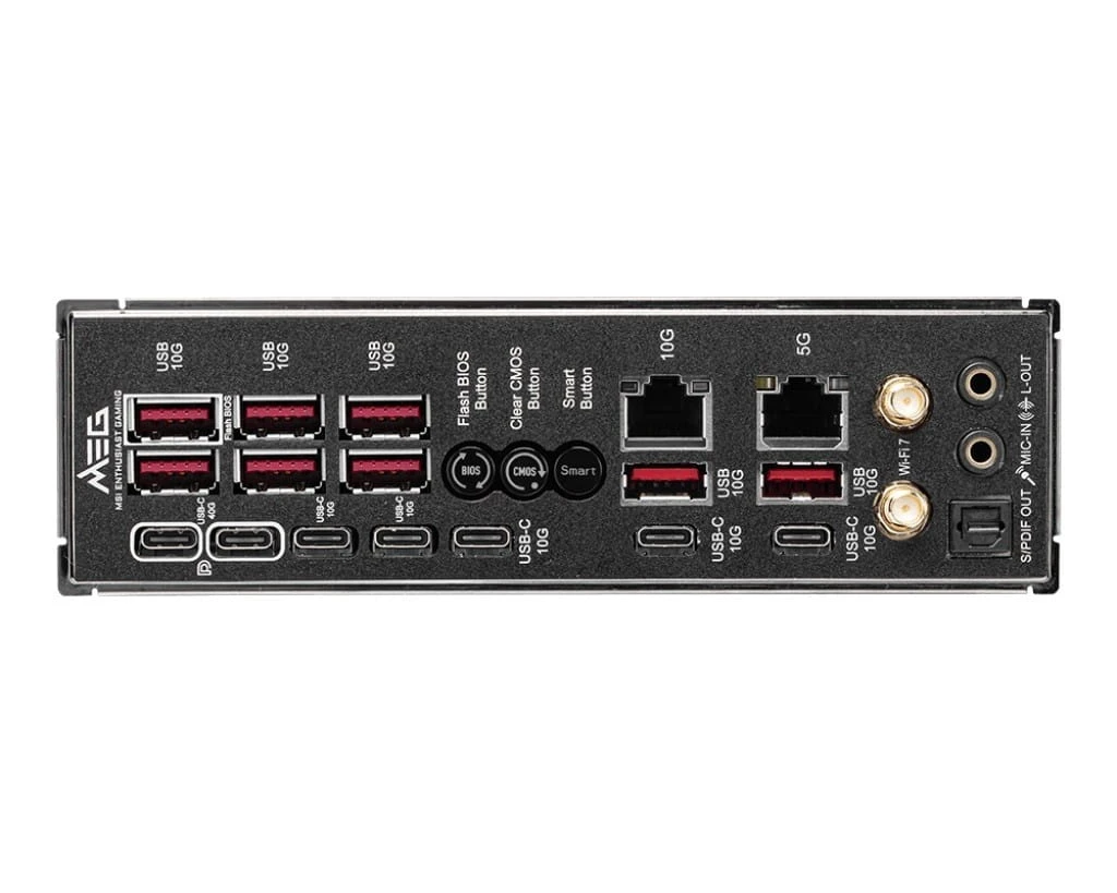 Złącza zewnętrzne: 1 x Przycisk Smart, 1 x Przycisk Clear CMOS, 1 x MIC (przód), 2 x RJ-45, 1 x S/PDIF, 8 x USB 3.1, 5 x USB 3.2 Gen 1 Type-C, 2 x USB 3.2 Gen 2 Type-C, 2 x SMA, 1 x Przycisk BIOS Flash