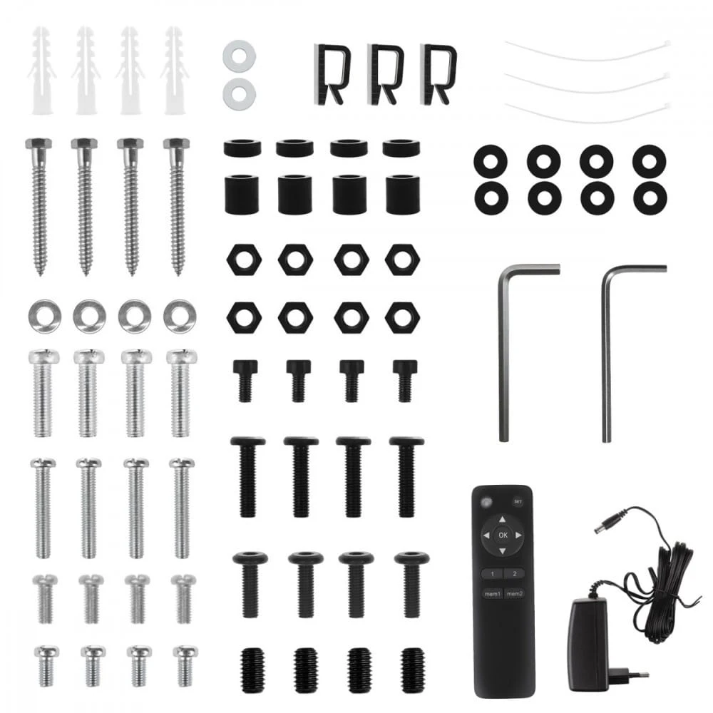 Akcesoria w zestawie: Uchwyt elektryczny do TV Maclean MC-110 T Zestaw śrub montażowych do sufitu oraz do przykręcenia telewizora Akcesoria montażowe Instrukcja montażu Opakowanie producenta