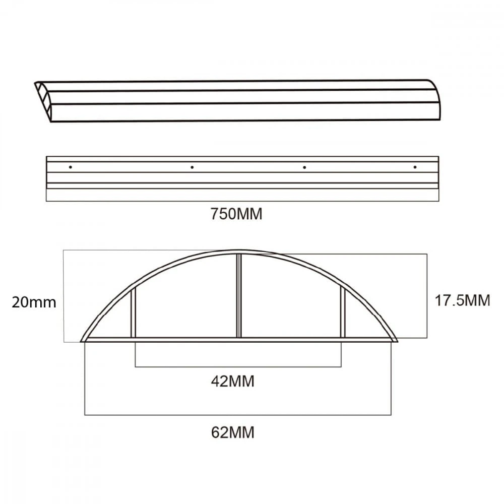 Wymiary: Długość: 750 mm Szerokość: 62 mm Szerokość wewnętrzna: 42 mm Wysokość: 20 mm Wysokość wewnętrzna: 17,5 mm Rozmiar śrub: 3,5x25 mm