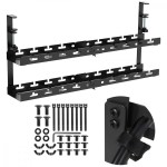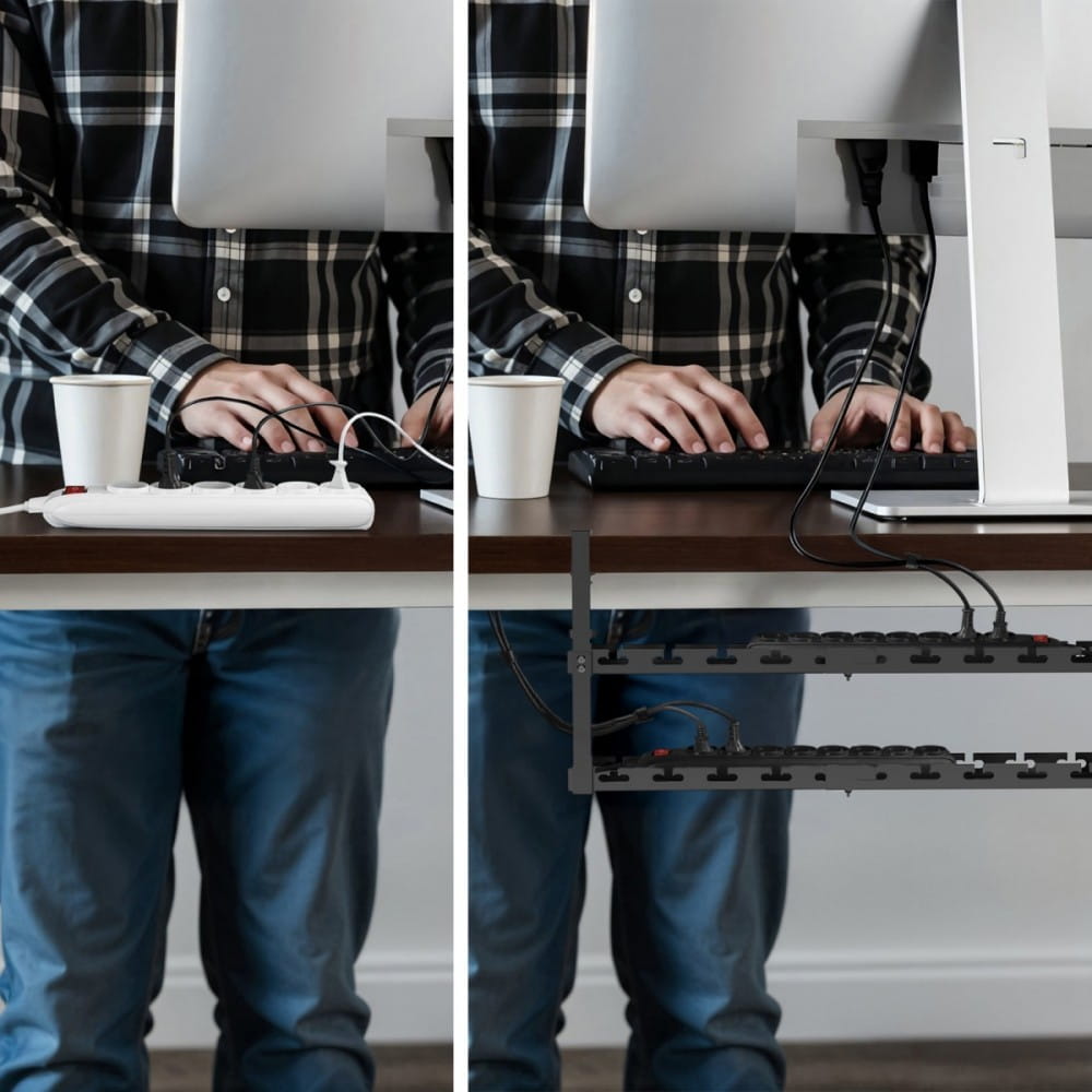 Dwupoziomowy organizer na listwę kablową montowany pod biurkiem to idealne rozwiązanie dla osób, które potrzebują więcej przestrzeni na uporządkowanie przewodów i sprzętu zasilającego. Dzięki regulowanej długości od 433 do 728 mm możesz łatwo dopasować go do różnych rozmiarów blatów i długości listew. Dwa poziomy uchwytów pozwalają na jednoczesne zamocowanie dwóch listw zasilających lub dodatkowych urządzeń, takich jak zasilacze, huby USB czy routery. Zaciskowy system montażu sprawia, że instalacja jest szybka i bezinwazyjna nie wymaga wiercenia ani naruszania powierzchni mebla.
