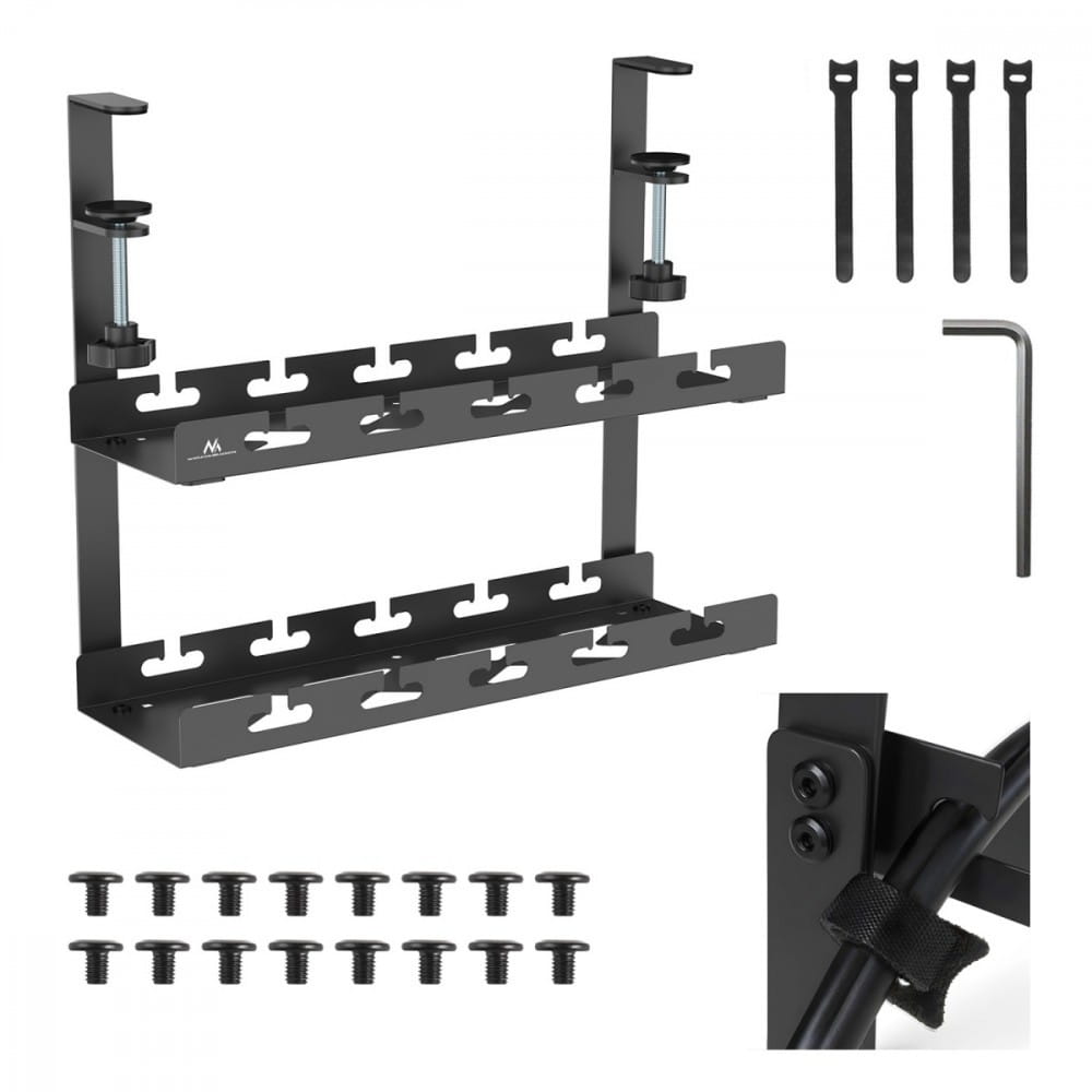 Akcesoria w zestawie: Organizer podbiurkowy na kable Maclean MC-104 B Opaski kablowe na rzep (5 sztuk) Akcesoria montażowe Opakowanie producenta