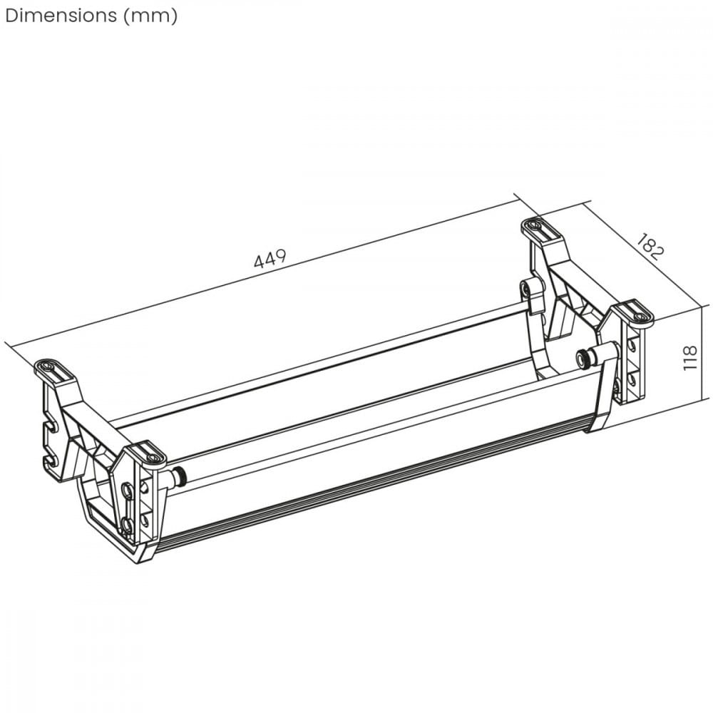 Wymiary: Wymiary całkowite (z mocowaniem do blatu): 449 x 182 x 118 mm Długość wewnętrzna pojemnika: 383 mm (całkowita 409 mm) Głębokość wewnętrzna pojemnika: 69 mm (całkowita 119 mm) Wysokość pojemnika: 69 mm Rozstaw otworów montażowych do blatu: 163 mm