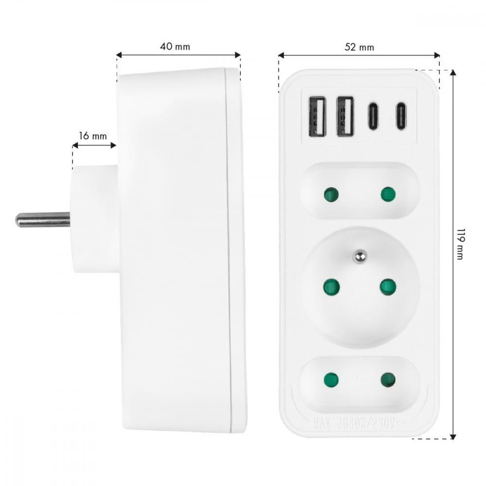 Pozostałe parametry: Kolor: biały Materiał obudowy: tworzywo sztuczne Źródło zasilania (napięcie): 110-240 V AC / 50/60 Hz Rodzaj gniazd: 2x gniazdo płaskie (typ C), 1x gniazdo okrągłe z bolcem uziemiającym (typ E) Maksymalne obciążenie: gniazda C - maks. prąd 6A 1380 W; gniazdo E - maks. prąd 16A 3680W Rodzaj portów USB: 2x USB-A, 2x USB-C Moc wyjściowa USB-A: 5V/3A, 9V/2A, 12V/1,5A, max. 18 W (przy użyciu jednego wyjścia) Moc wyjściowa USB-C: 5V/3A, 9V/2,22A, 12V/1,67A, max. 20 W (przy użyciu jednego wyjścia) Zabezpieczenie przed dziećmi: tak - Stopień ochrony: IP20