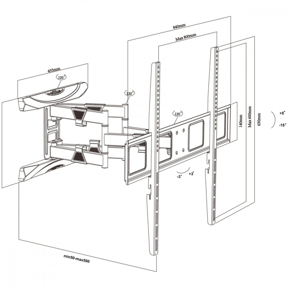 Bardzo długie, podwójne ramię uchwytu pozwala na szeroki zakres obrotu telewizora. Dodatkowo istnieje możliwość poziomowania telewizora po zamontowaniu +3/-3°. Do uchwytu bez problemu przymocujemy ekran w standardzie VESA: 100x200, 200x200, 200x300, 300x200, 200x400, 400x200, 300x300, 300x400, 400x300, 600x200, 400x400, 600x300, 400x600, 600x400, 700x400, 800x400, 600x600, 800x500, 800x600 mm. W komplecie znajduje się poziomica, która ułatwia precyzyjny montaż, oraz zestaw śrub montażowych, co czyni instalację prostą i bezproblemową.
