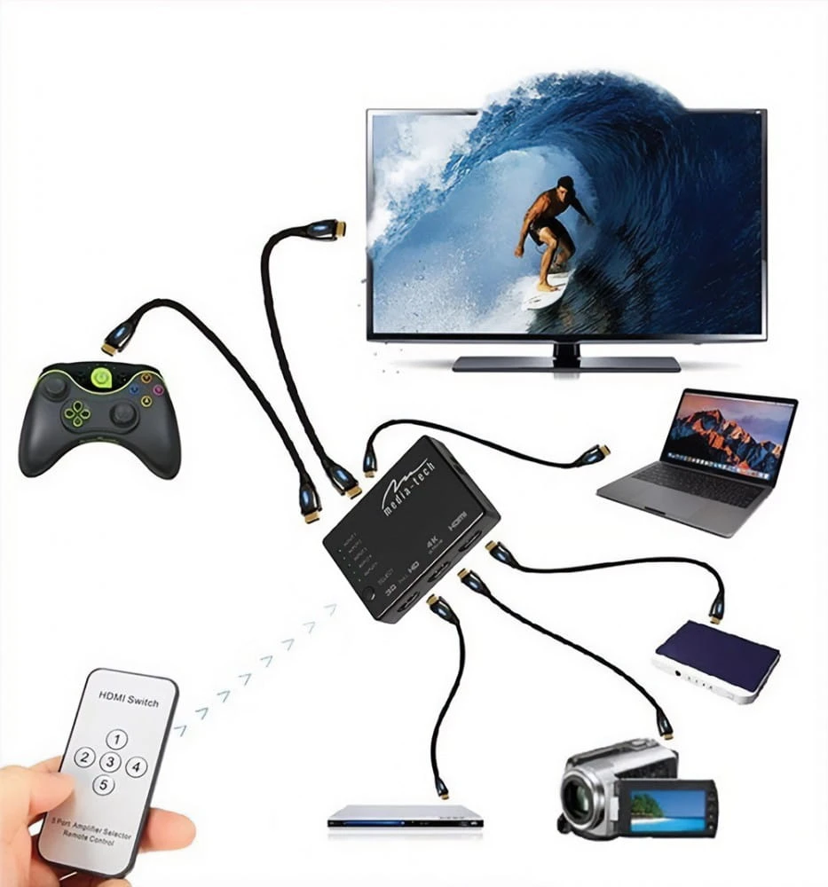 5xHDMI SWITCH służy do przełączania obrazu z aż 5 różnych urządzeń podłączonych do portów wejściowych przełącznika.