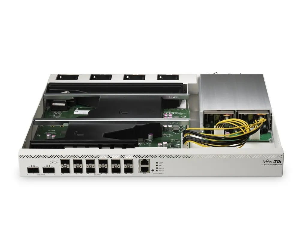 Router posiada 2 porty QSFP28 dla połączeń 100Gbps, 12 portów SFP28 dla połączeń sieciowych 25Gbps oraz jeden port Gigabit Ethernet. Urządzenie wyposażono w 16 GB RAM, 128 MB pamięci NAND oraz dwa gniazda M.2 SATA na dodatkową pamięć. CCR2216-1G-12XS-2XQ posiada również 4 wentylatory oraz dwa redundantne, wymienialne na gorąco zasilacze. Zasilacze są takie same jakie zastosowano w CCR1072.