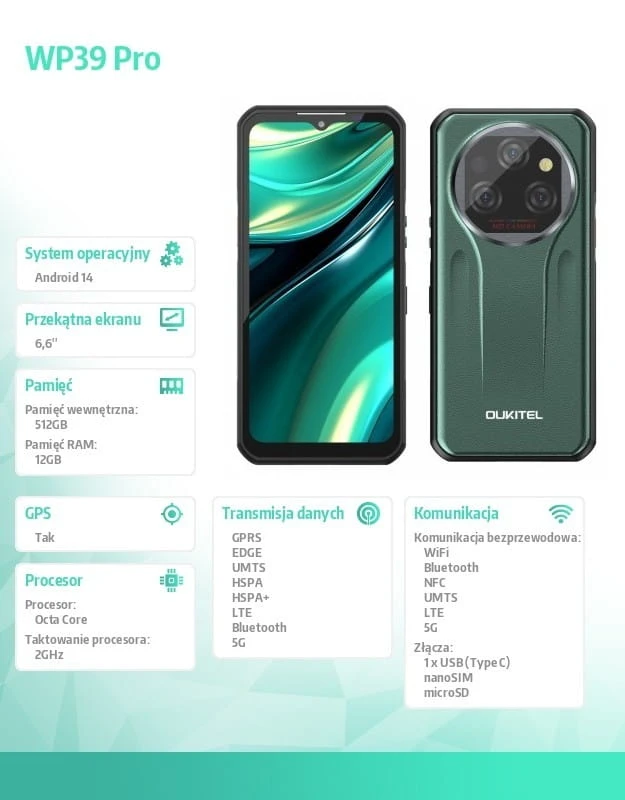 OUKITEL Smartfon WP39 Pro 5G 12/512GB IP69K zielony