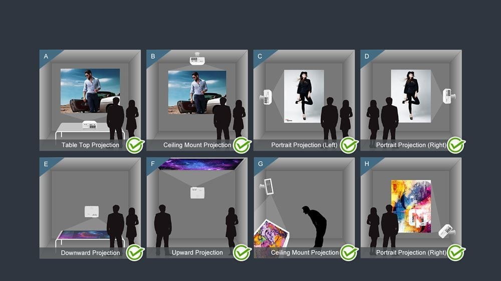 Obrazy można wyświetlać w pełnym zakresie 360° wzdłuż osi poziomej projektora.