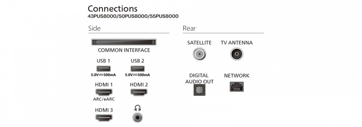 Gniazda we/wy: 3 x HDMI, 1 x 3,5 mm minijack, 2 x USB 2.0, 1 x RJ-45 LAN, 1 x SPDIF out, 1 x Gniazdo CI/Cl+, 1 x Wejście antenowe, 1 x Satellite