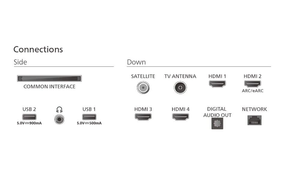 Gniazda we/wy: 1 x RJ-45 LAN, 1 x Audio out, 1 x Satellite, 4 x HDMI, 2 x USB 2.0, 1 x Gniazdo CI/Cl+, 1 x Wejście antenowe, 1 x 3,5 mm minijack