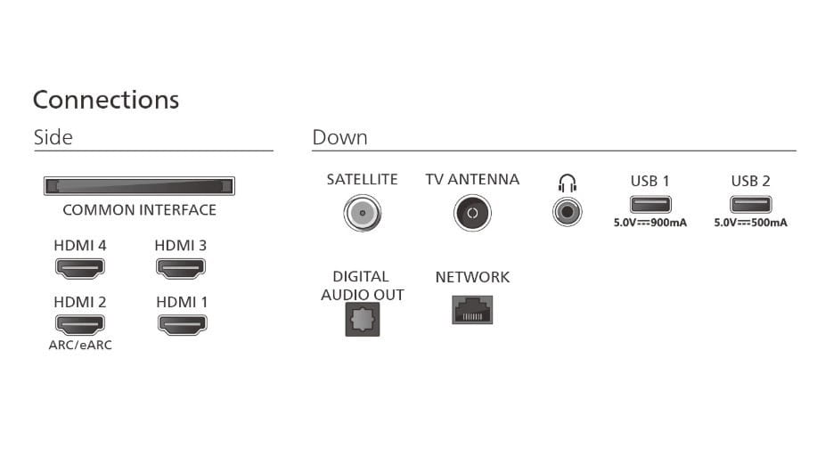 Gniazda we/wy: 1 x Wejście antenowe, 1 x Gniazdo CI/Cl+, 1 x 3,5 mm minijack, 4 x HDMI, 2 x USB 2.0, 1 x RJ-45 LAN, 1 x Audio out, 1 x Satellite