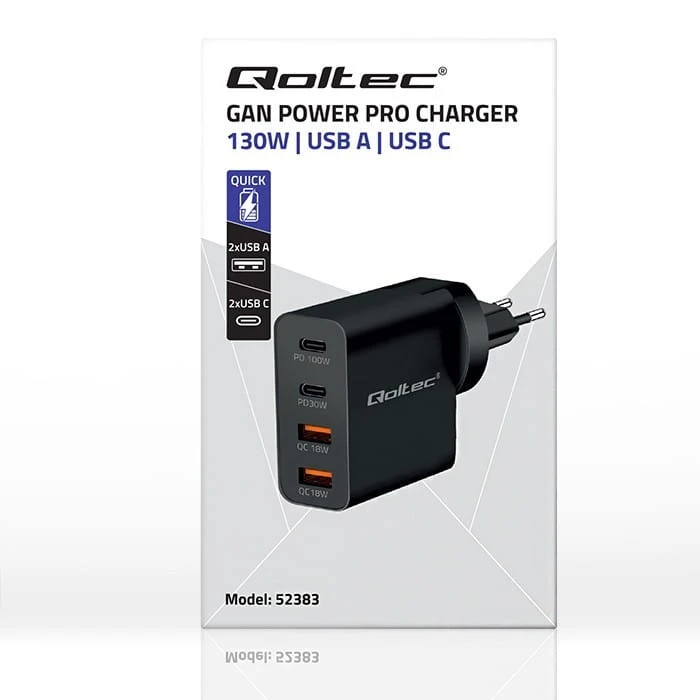 Ładowarka marki Qoltec została wyposażona w najnowocześniejszą technologię ładowania GaN polegającą na zastosowaniu nowego materiału półprzewodnikowego azotku galu. W zależności od rodzaju ładowanego urządzenia ładowarka dobiera odpowiednie napięcie i natężenie w zależności od parametrów baterii, chroniąc ją przed przegrzaniem.