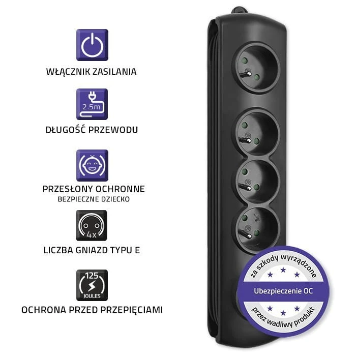 Chcąc zapewnić ochronę Tobie i innym użytkownikom urządzeń podłączonych do listwy wyposażyliśmy ją w szereg zabezpieczeń: