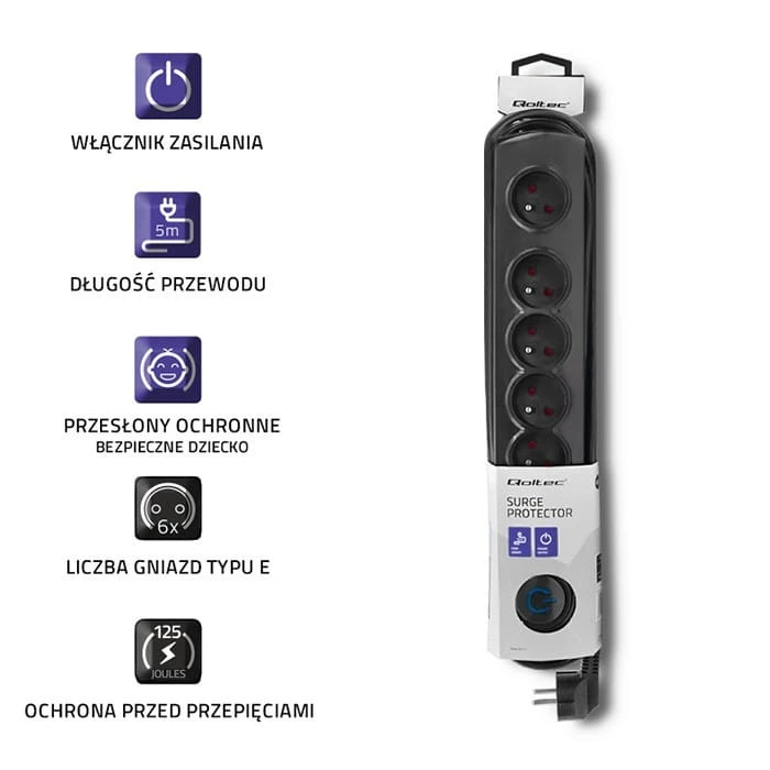Qoltec Listwa antyprzepięciowa | 6 gniazd | 5m