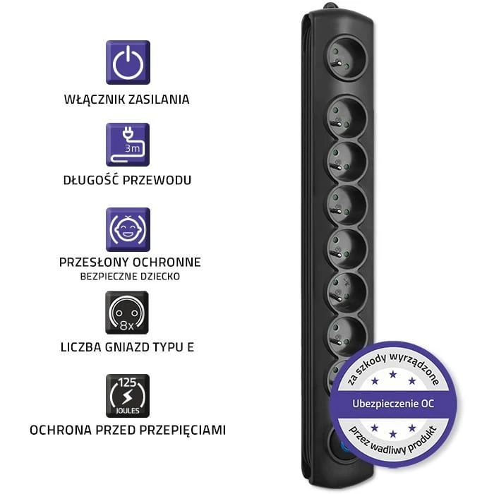 Chcąc zapewnić ochronę Tobie i innym użytkownikom urządzeń podłączonych do listwy wyposażyliśmy ją w szereg zabezpieczeń: