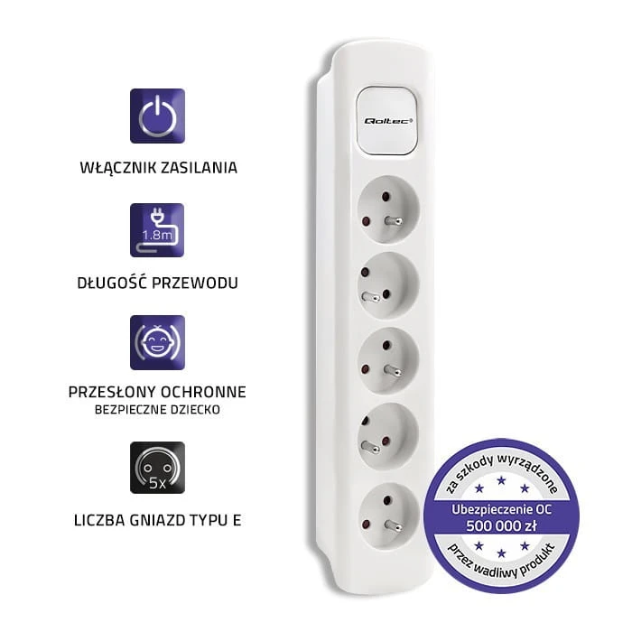 Qoltec Listwa zasilająca | 5 gniazd | 1.8m | Biała